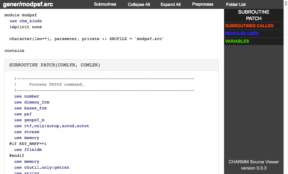 CHARMM Source Viewer v0.0.3 is a python library for marking up the CHARMM source code. Current functionality includes a drop-down menu to jump to a specific subroutine, the ability to collapse subroutines for improved readability, and hyperlinks for used modules and called subroutines to quickly access referenced code.
